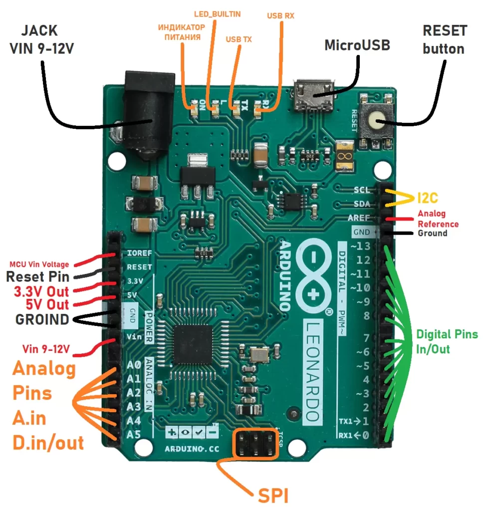 - I2C: Находится на пинах 2 (SDA) и 3 (SCL). Это стандартное расположение для Leonardo.